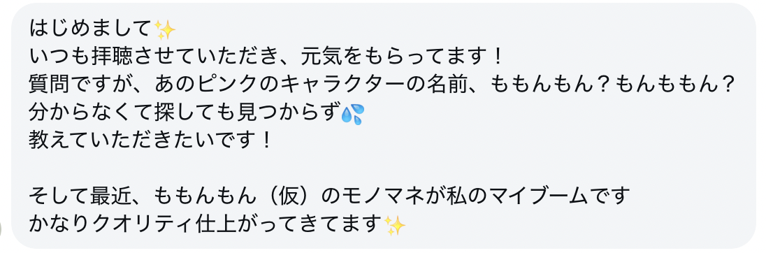 いつも拝聴させていただき、元気をもらってます! 質問ですが、あのピンクのキャラクターの名前、ももんもん?もんももん? 分からなくて探しても見つからず